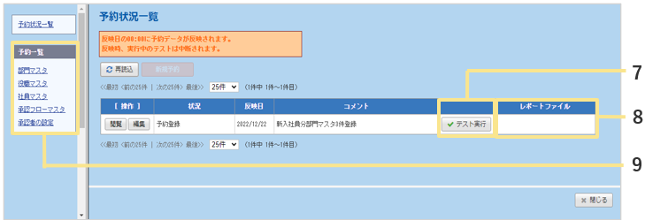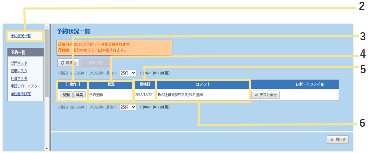 状況が「予約登録」の行にのみ表示されます。クリックすると、「反映テスト」が実行されます。