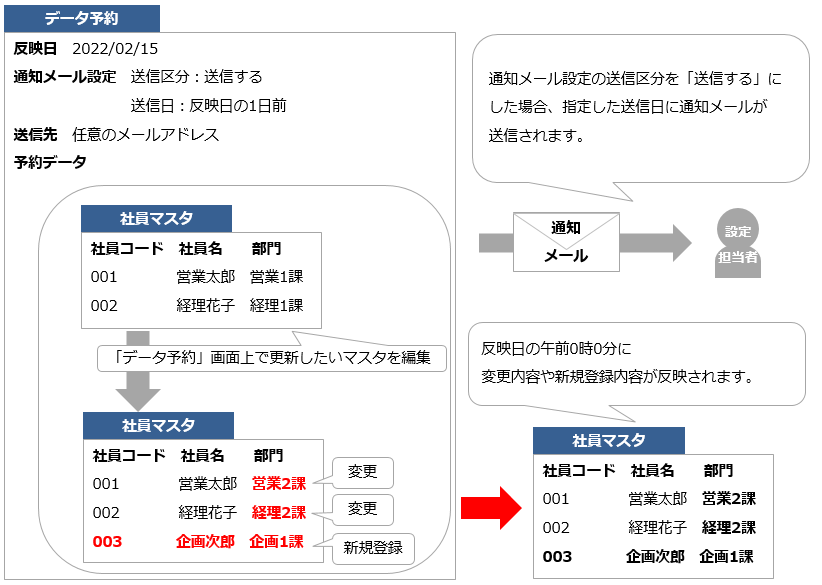 - 指定した日時の午前0時頃に、マスタ情報などを一括変更するための機能です。