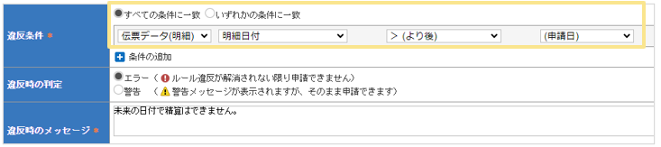 トップ > よくある質問 > 申請時の質問 > 申請ルール 未来の日付で申請された場合、エラーにしたい 楽楽精算CS 2023/03/21 09:00 申請ルール 未来の日付で申請された場合、エラーにしたい 「申請ルール設定」にて設定ができます。 ■手順 1.「管理」タブ >「申請ルールの設定」をクリック2.「新規登録」をクリック3.設定する申請ルールの「ルール名」を入力4.違反条件を以下のように設定 5.「違反時のメッセージ」を設定 【例】未来の日付で精算はできません。6.このルールを適用する「申請種別」にチェック7.「確定」をクリック≪完了≫ (記事ID:3218) いいね 共有する 共有する リンクをコピー