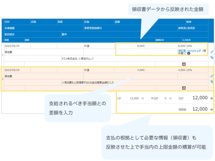 手当の自動計算を活用せず、領収書データから反映された金額を利用します。