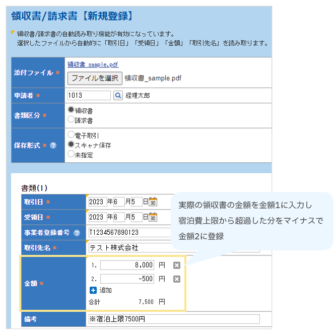→この場合、超過金額を明細で追加せずとも領収書登録時にマイナス金額を入力することで