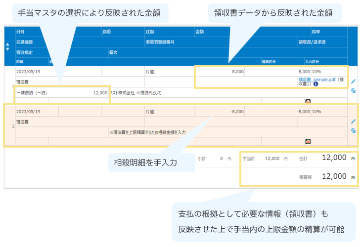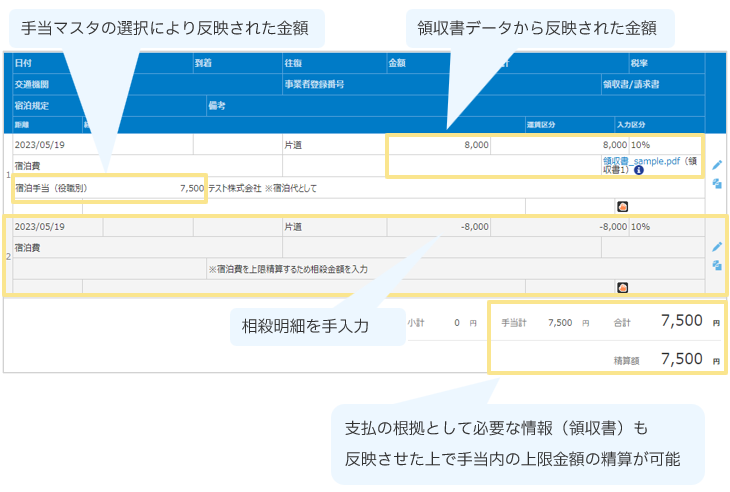 領収書を添付、かつ手当の自動計算機能は活用した上で相殺明細を作成する