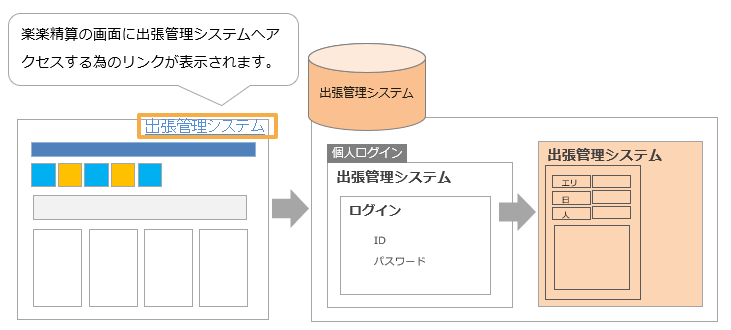 - 「楽楽精算」上からお客様がご利用の出張管理システムへアクセスすることができます。