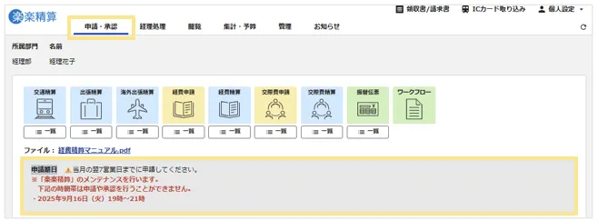 「楽楽精算」画面上の「申請・承認」タブの「メッセージ欄」や「お知らせ」で告知。