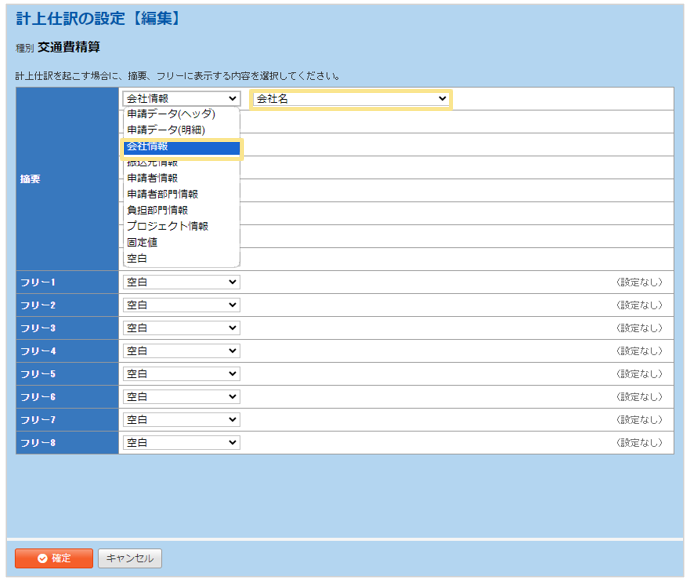 「摘要、フリーの設定」欄の選択肢に、「会社情報」として表示されます。