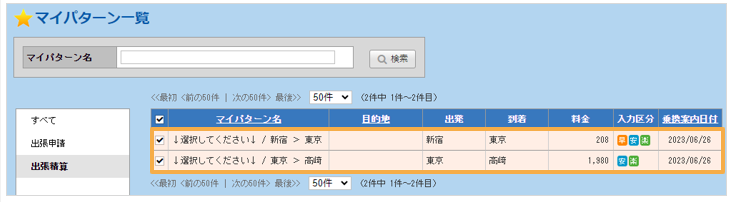 1. マイパターンから呼び出したいパターンにチェック(ここでは「出張精算」を想定)