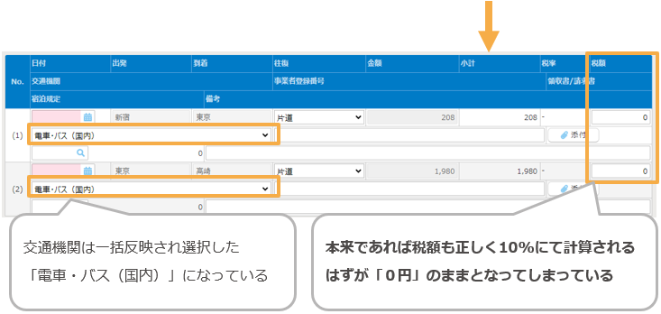 ≪完了≫交通機関を一括反映する際、特定の条件下で正しく税額が計算されない事象について