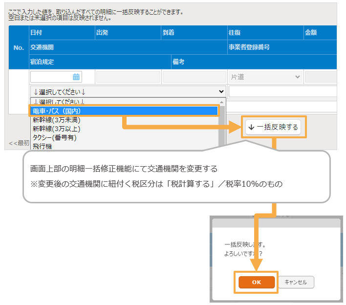 3. 明細一括修正機能にて変更したい交通機関を選択し、「一括反映反映する」をクリック