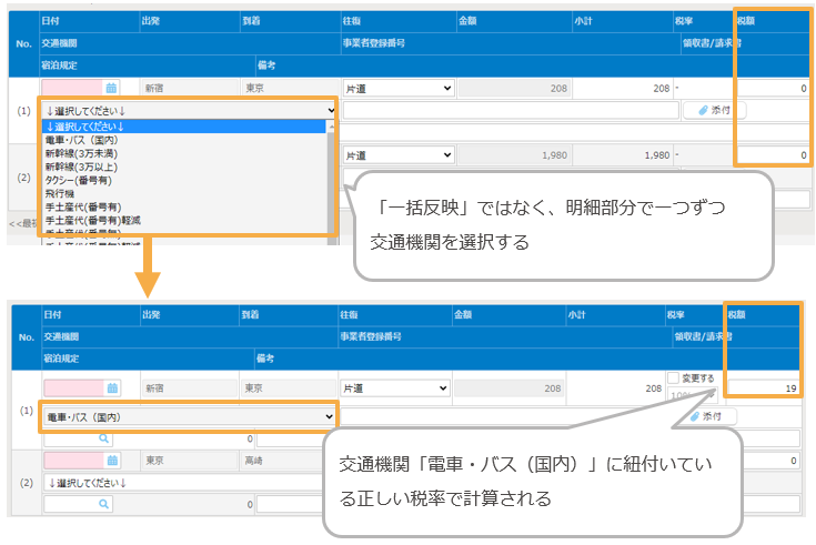 - 変更前と変更後の交通機関とで、紐付く税区分マスタの