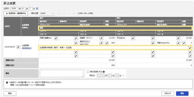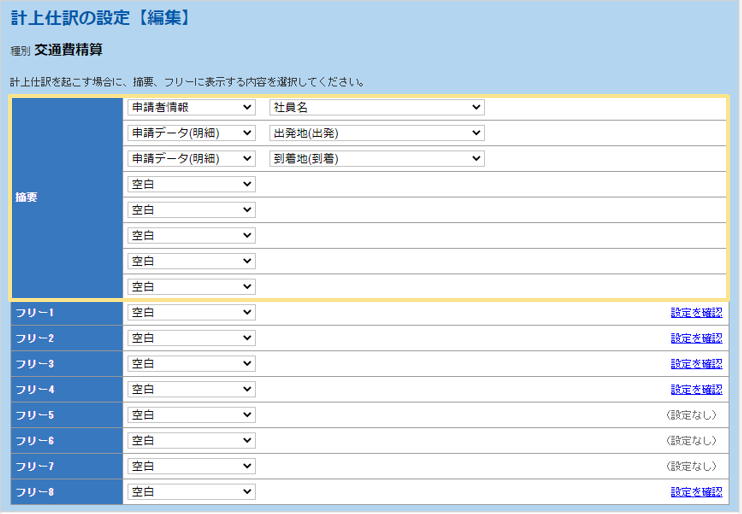 2. 「フリー1」~「フリー8」に、摘要欄に出力したい内容を設定