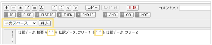 各項目の間に半角スペースを入れたい場合は、「摘要」と「フリー1」、「フリー1」と