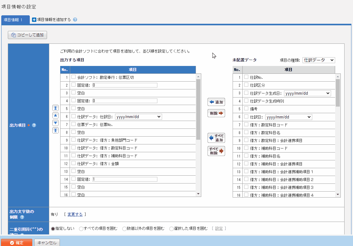 「管理」タブ > 「仕訳データ出力の設定」で各仕訳の出力設定の「出力項目」に