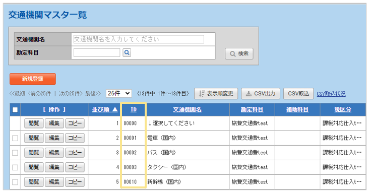 新規登録をする際にはまだ「ID」が存在しないため「CSV取込」でマスタの新規登録をする際に
