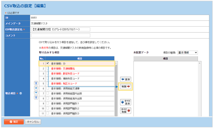 - 「取込項目」の「取り込みする項目」にある「基本情報:ID」を削除
