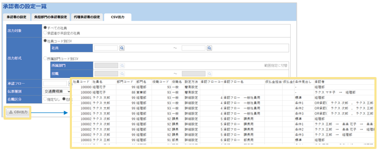 また、特定の承認フローが設定されている社員の一覧を出力することもできますので、
