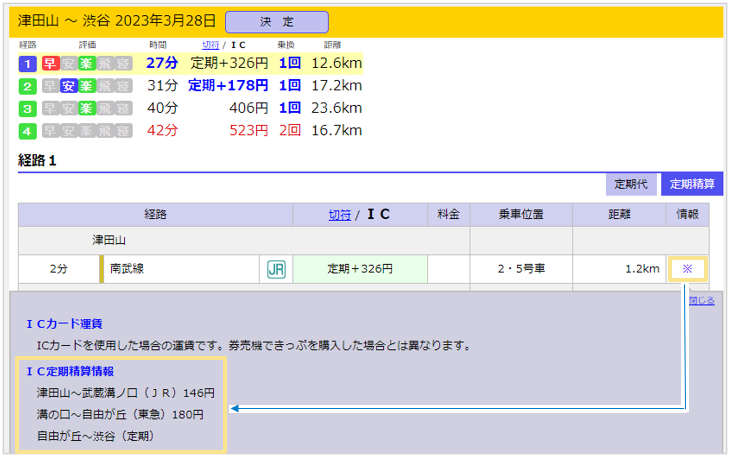 IC定期を利用し、精算した場合にどの経路を通過したとみなして金額を算出したかを