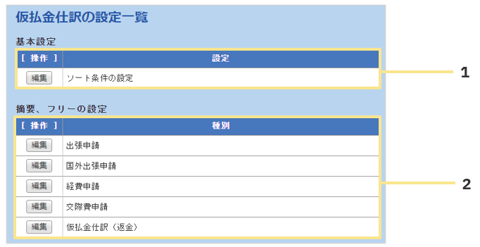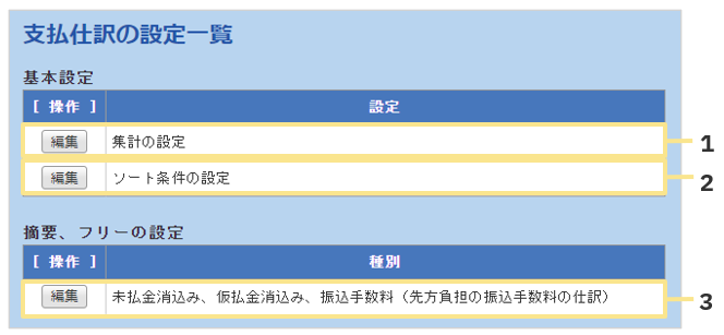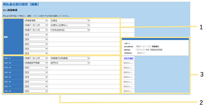 概要 関連する設定マニュアル イメージ図 関連のあるメニュー 設定が反映される画面 設定の前に準備すること 設定画面の説明 ▶仮払金仕訳の設定 ▶計上仕訳の設定 ▶摘要、フリーの設定 ▶支払仕訳の設定 ▶振替仕訳の設定 摘要、フリー欄に設定できる項目の説明 |