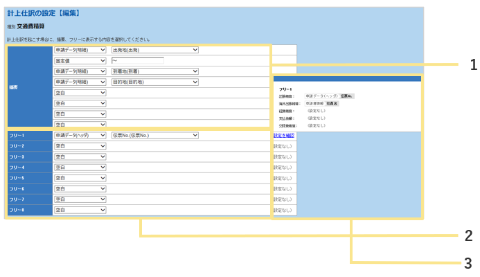 設定した項目が計上仕訳の「プレビュー画面」の「フリー1~8」に表示されます。