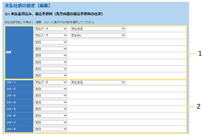 支払仕訳の摘要、フリーに出力する項目を選択します。