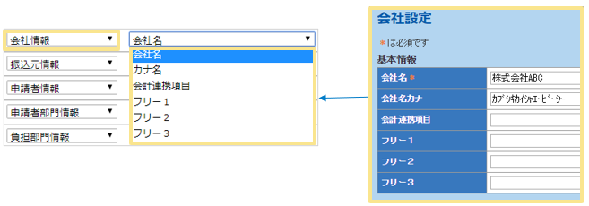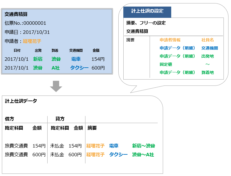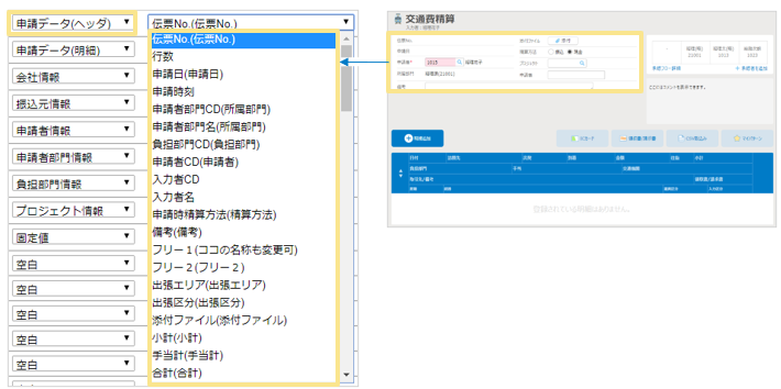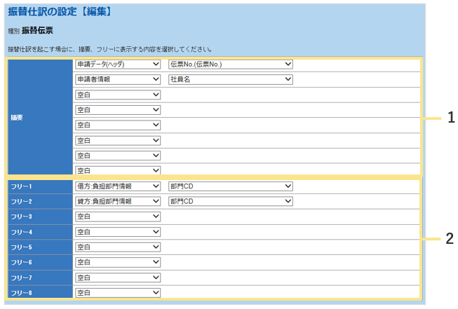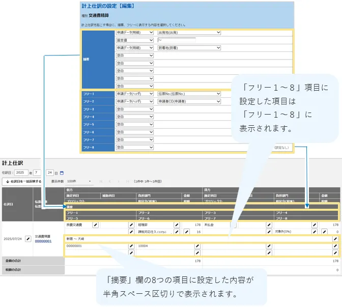 伝票の情報を摘要やフリー欄などに設定することができます。