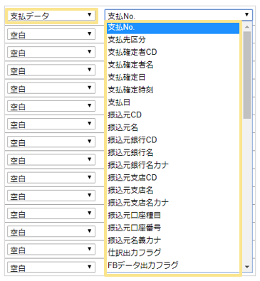 「支払確定」「支払仕訳」「FBデータ出力」などで保持している内容を選択し、出力ができます。
