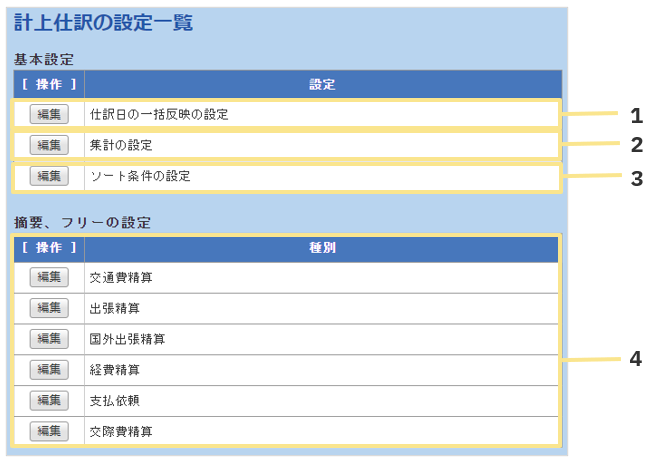 - 以下の仕訳の摘要やソート順、集計などを設定します。