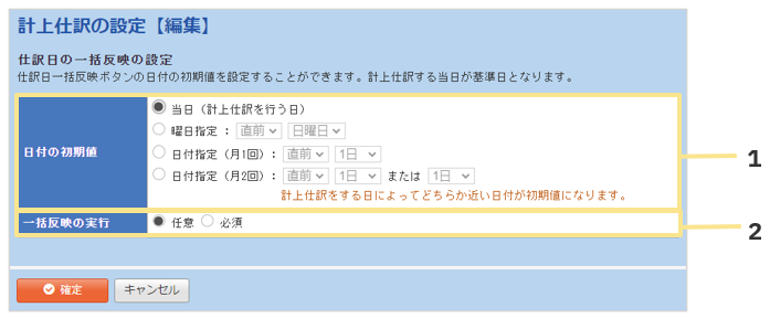 仕訳日一括反映ボタンの日付の初期値を「当日(計上仕訳を行う日)」「曜日指定」