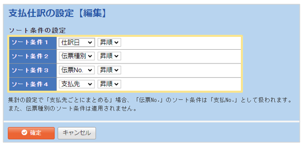 支払仕訳のソート条件を設定します。仕訳データの並び順を変更したい場合に設定してください。