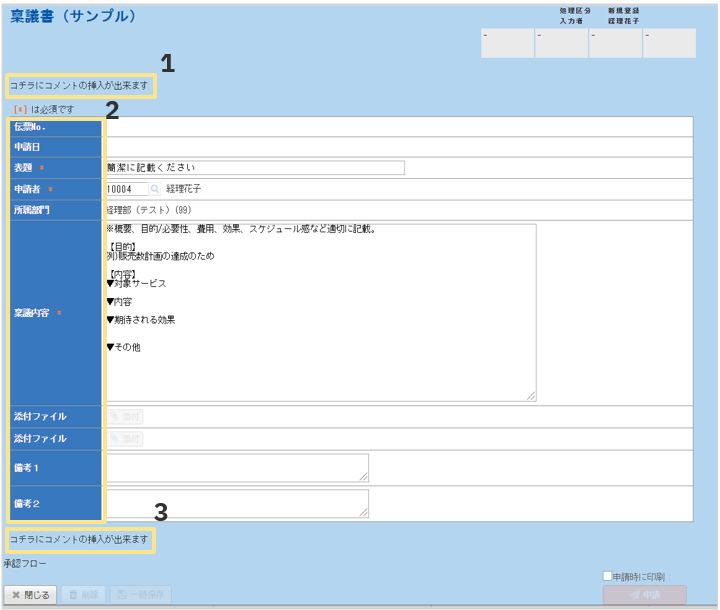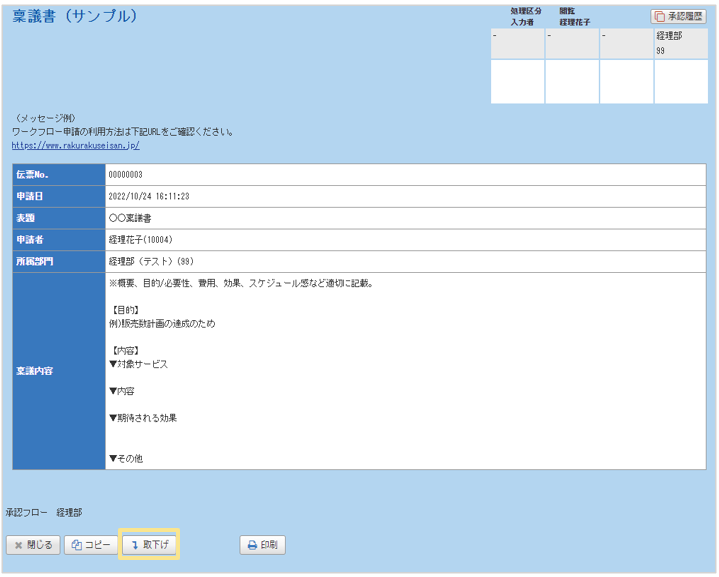 「ワークフロー設定」で設定したコメントが掲載されます。
