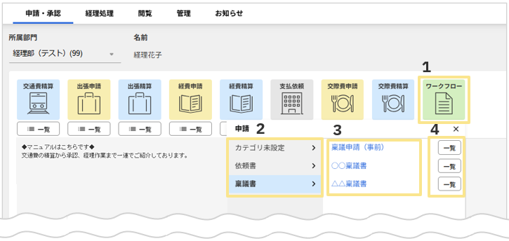 カテゴリを選択すると、申請可能なワークフロー名が表示されます。