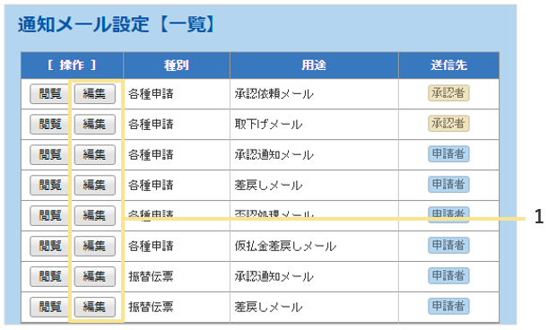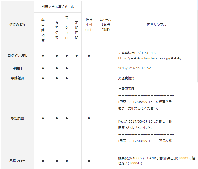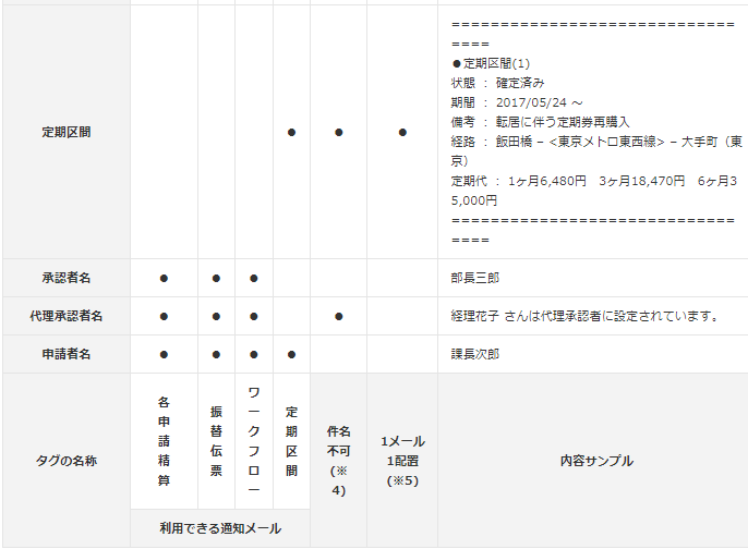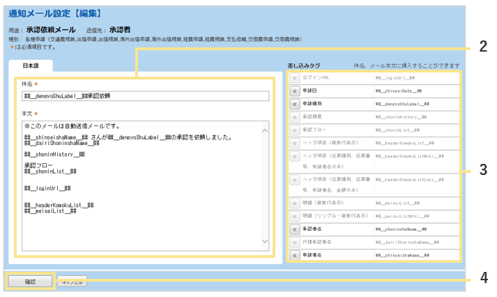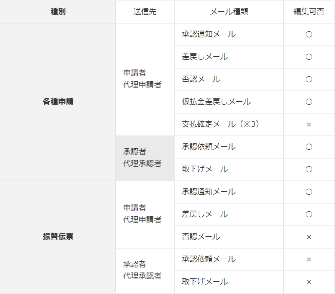 本文の内容を設定できます。 - 各種申請、振替伝票、ワークフローごとにメールの内容を設定できます。