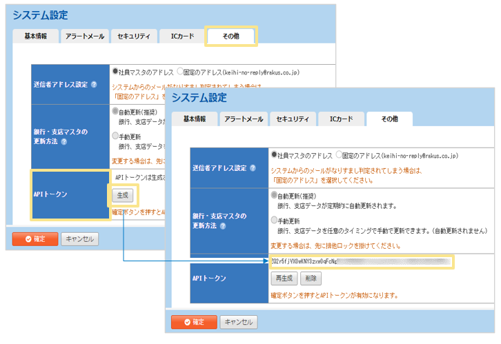 「確定」をクリックすると、再生成後のAPIトークンが「楽楽精算」に登録されます。