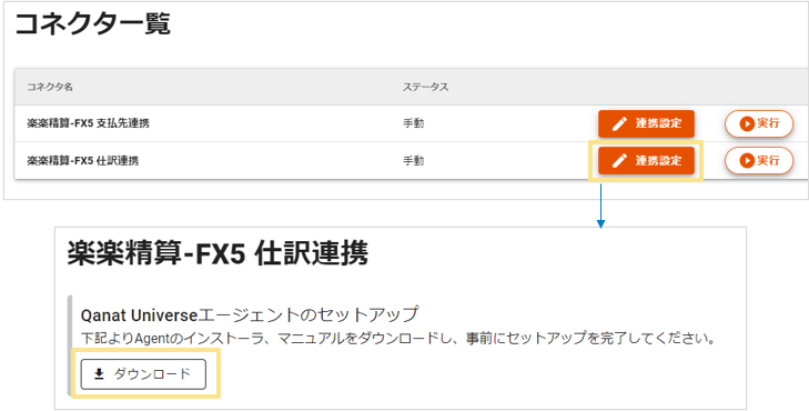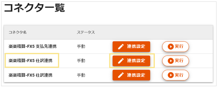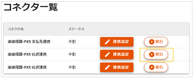 1.「コネクタ一覧」で「楽楽精算‐FX5 仕訳連携」の「実行」ボタンをクリック