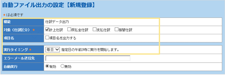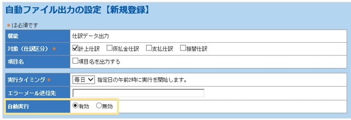 「自動ファイル出力の設定」で設定された頻度(毎日、毎週、毎月)および出力開始時間に