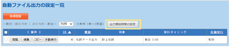 「自動ファイル出力の設定」>「手動実行」ボタンから手動でファイル出力の実行ができます。