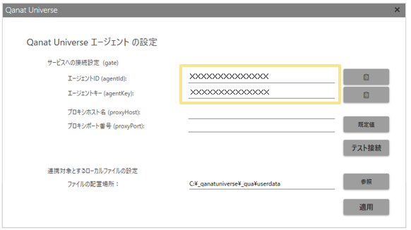・AgentKey →「Qanat Universe Agent」に表示される「エージェントキー」を入力