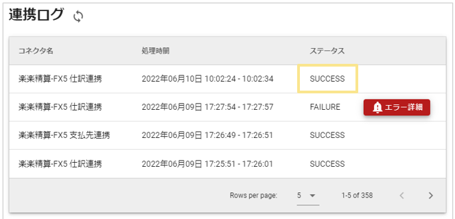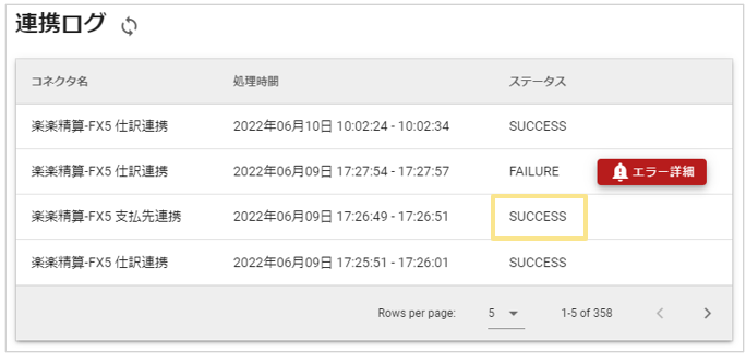 ※「コネクタ一覧」の「連携ログ」にて、実行結果が表示されます。