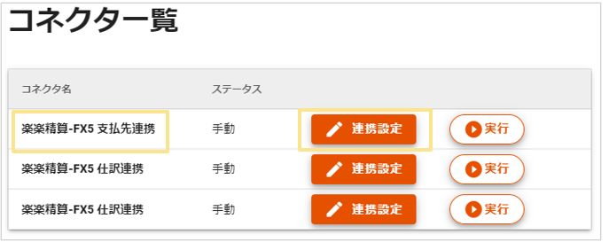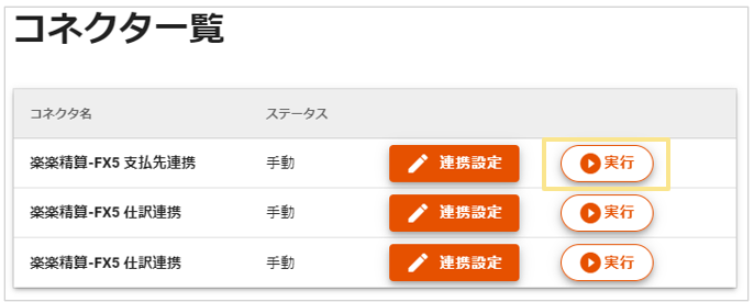 2.「コネクタ一覧」で「楽楽精算‐FX5 支払先連携」の「実行」ボタンをクリック