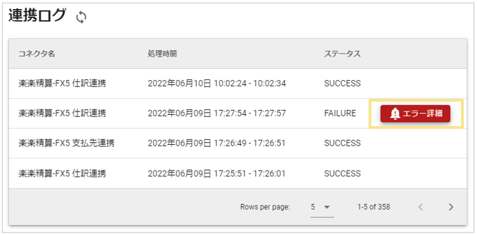 連携エラーがある場合は「コネクタ一覧」の「連携ログ」に「エラー詳細」ボタンが表示されます。