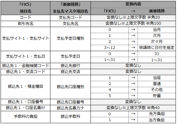 ▶項目の変換表(「FX5」→「楽楽精算」)