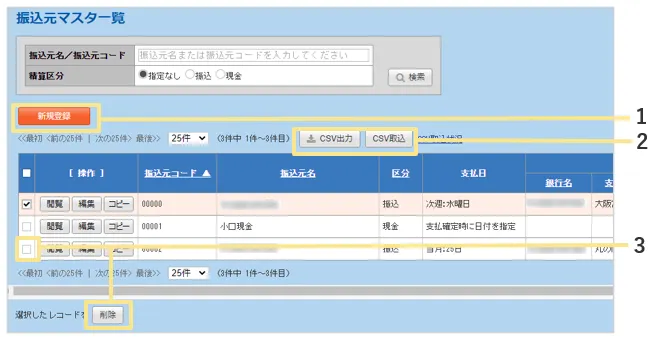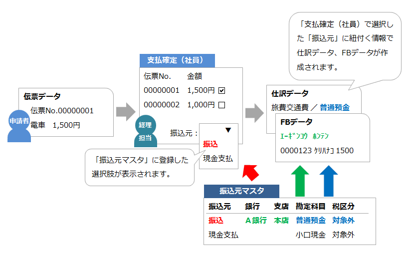 現金支払いがある場合は、精算区分で「現金」を選択した「振込元マスタ」を作成します。