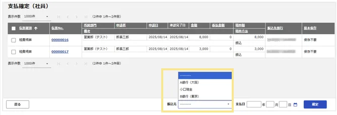 「支払確定(社員)」「支払確定(支払先)」「仮払金支払確定」の「振込元」の選択肢として