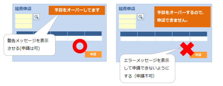 - 申請・精算金額が予算を超える申請だった場合に、警告やエラーを出すことができます。