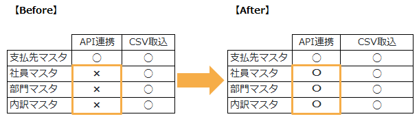取り込む際に、CSV取込にて手動連携している以下マスタについて、API連携が可能になります。