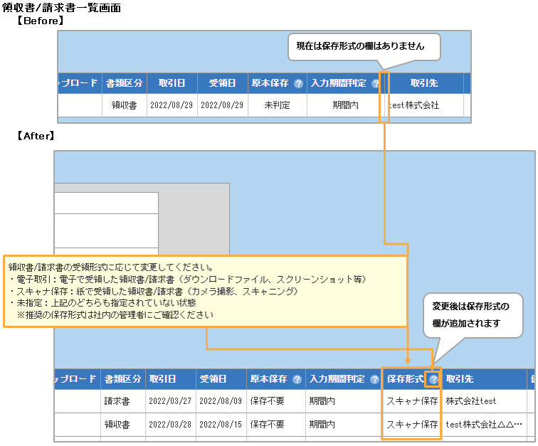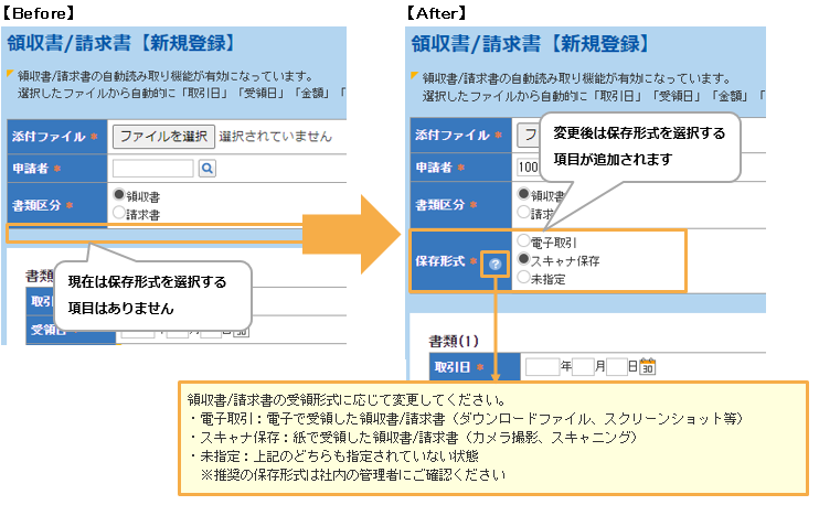 領収書/請求書の保存形式は指定・変更できません。 - 本仕様変更より前に登録されている「領収書/請求書」の保存形式は元々保持している情報が
