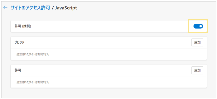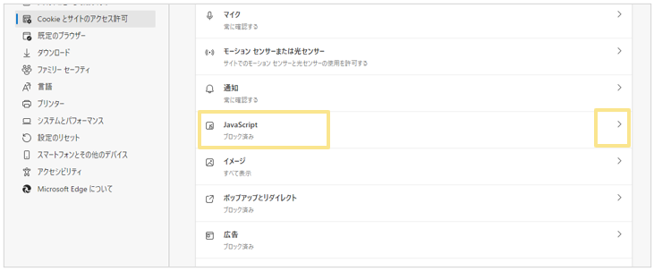 - 「JavaScript」を確認し、「許可済み」になっていない場合は「 > 」をクリックして許可する
