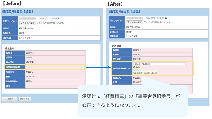 ≪完了≫「経費精算」の承認時に領収書/請求書上の「事業者登録番号」を修正する機能を追加