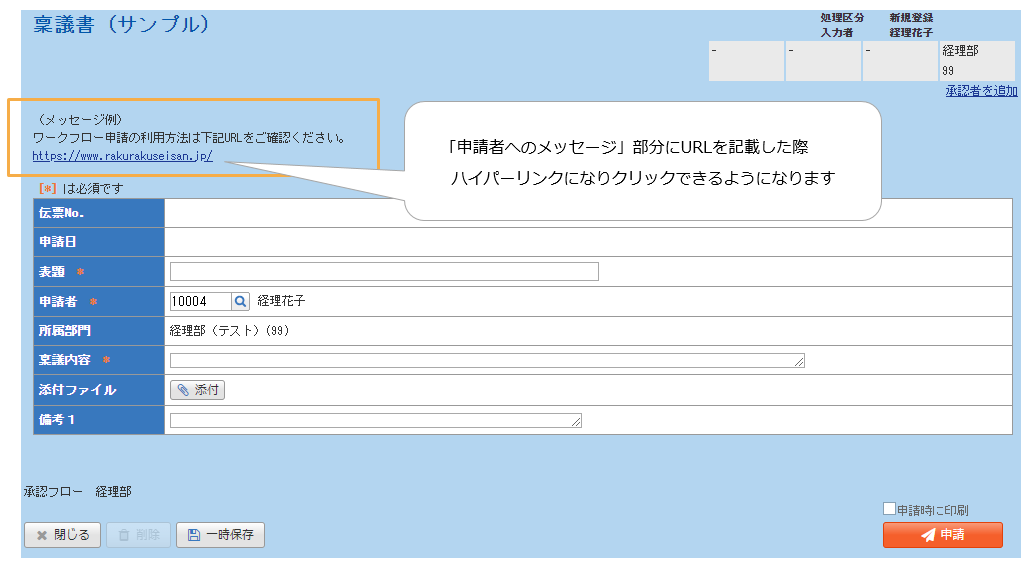 トップ > お客様の声で機能開発中! > リリースのお知らせ > 2022.5|ワークフローオプション ハイパーリンク対応しました! 楽楽精算CS 2023/01/01 09:00 2022.5|ワークフローオプション ハイパーリンク対応しました! ▶ お預かりしていたお客様の声 ワークフロー伝票入力画面で、申請者に参照させたいWebサイトがある URLを入力してもハイパーリンクにならないのでコピペが手間 ▶ 機能改善しました! 「申請者へのメッセージ」部分に記載したURLがハイパーリンク化されるように改修しました!ぜひご活用くださいませ。 (記事ID:9006) 2022.5WFハイパーリンク 結果発表 いいね 16票 投票する いいね 共有する 共有する リンクをコピー
