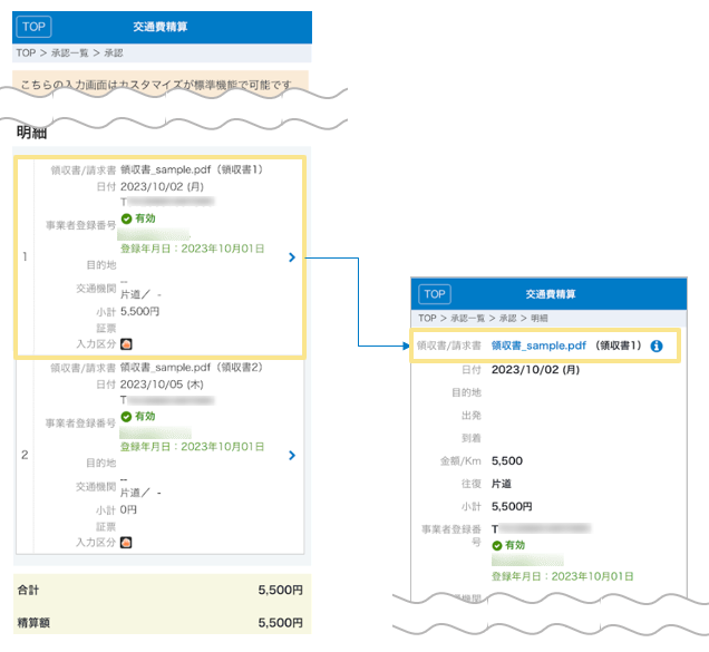 2. 領収書/請求書の添付されている明細を選択し、明細画面の領収書/請求書項目の