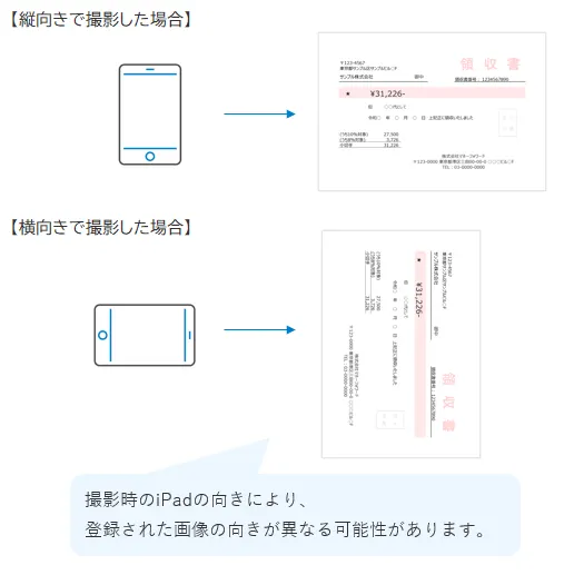 iPad上で「楽楽精算」アプリをご利用いただく際、電子帳簿保存法オプションにて領収書/請求書を撮影する際に、撮影時の端末の向きと画像の表示向きが異なる場合があることを確認しております。(【例】縦向きで撮影したが横向きで表示される)
